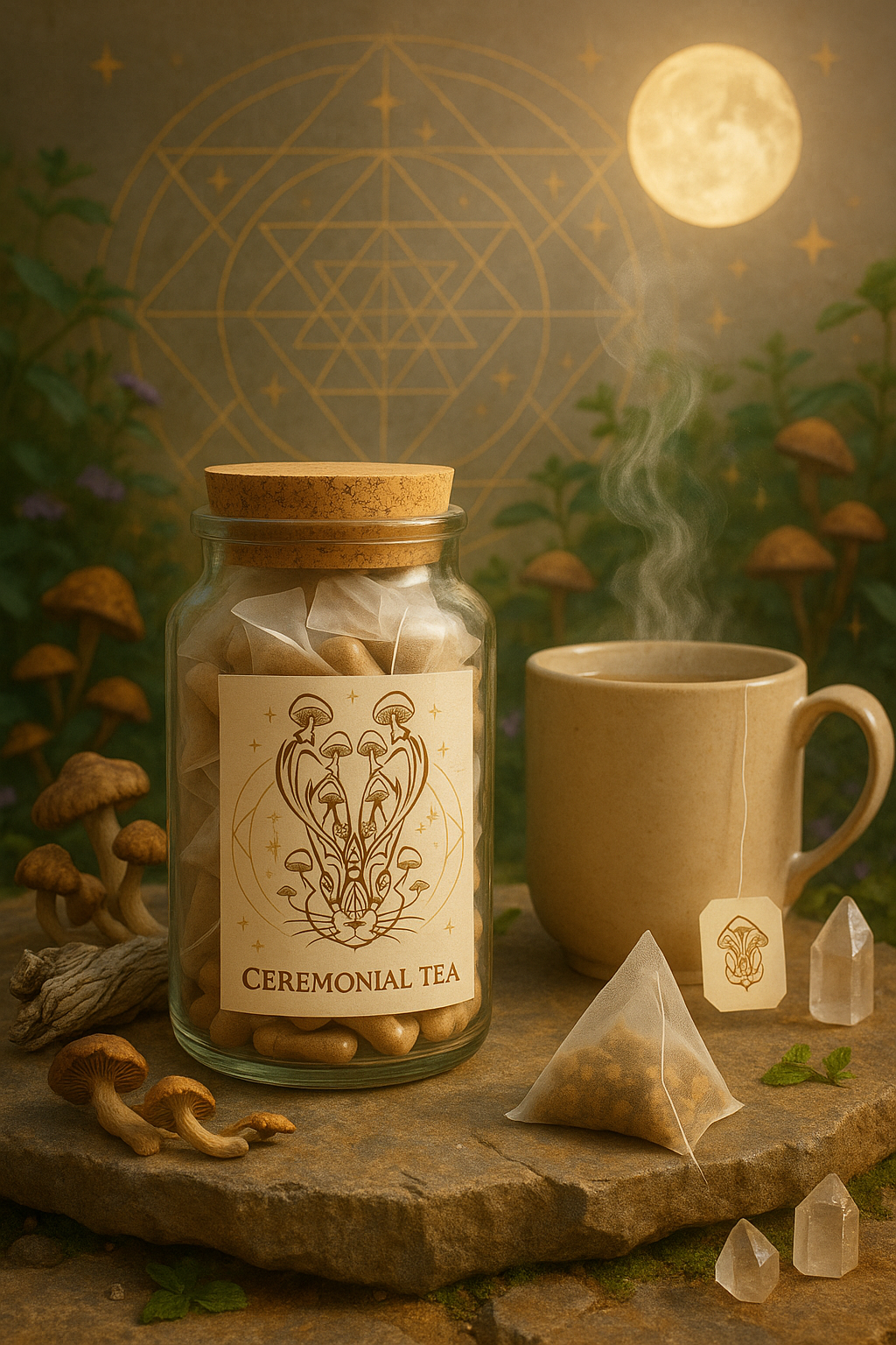 Crafted with care for those walking an advanced path, Ceremonial Meditation Tea is designed to support profound inner journeys and sacred exploration. Each tea bag contains 2g of active sacred mushroom fruiting bodies, blended with refreshing mint and bright lemon to create a grounding yet uplifting brew.